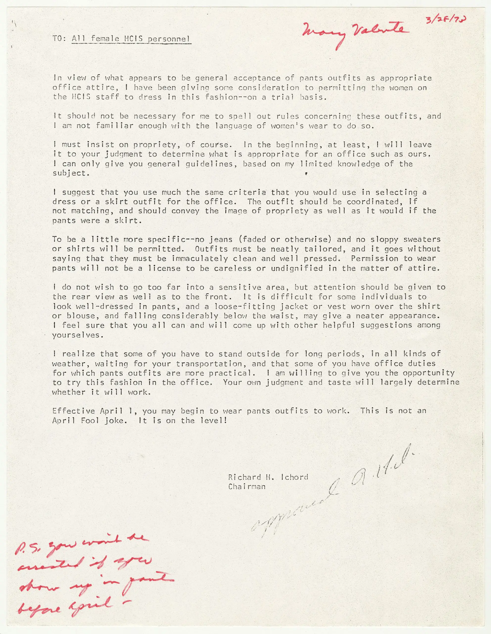 Full Citation: Memo to All Female Staff of Internal Security Committee; Administrative Files of the Records of the Administrative Section of the Internal Security Committee During the 81st through 94th Congresses; Committee Papers, 1945–1975; Records of the U.S. House of Representatives, Record Group 233; National Archives Building, Washington, DC. [Online Version, https://docsteach.org/document/memo-to-all-female-staff-of-internal-security-committee/, January 8, 2026]