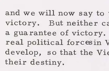 In October 1972, a defeated North Vietnam made concessions and Kissinger announced “peace is at hand.” In this conversation with North Vietnamese representatives from Hanoi, Kissinger succinctly stated the Nixon administration’s goals: “We will not give Saigon [South Vietnam] a guarantee of victory. But neither can we make an agreement which gives your side a guarantee of victory. What we want is an agreement which gives the real political forces in Vietnam an opportunity…to develop, so that the Vietnamese people…can determine their destiny.”