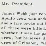 In this memorandum, Jim Jones informs the President of the fire that kills the crew of Apollo 1. The President read the note aloud at the White House reception for Secretary of Commerce, John T. Connor. Virgil “Gus” Grissom, Roger Chaffee and Edward White died in the fire.
