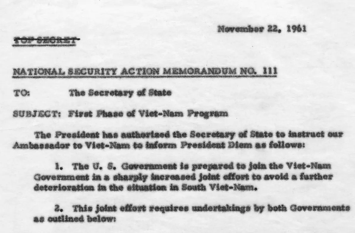 Full Citation: National Security Action Memorandum No. 111 First Phase of Vietnam Program; 11/22/1961; National Security Files: Meetings and Memoranda: National Security Action Memoranda; Meeting Records and Memoranda, 1961 – 1963; Collection JFK-4: Papers of John F. Kennedy: Presidential Papers: National Security Files,; John F. Kennedy Library, Boston, MA. [Online Version, https://docsteach.org/document/memorandum-no-111-first-phase-vietnam/, April 1, 2026]