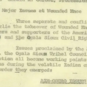 This memo details separate and conflicting sets of issues in regard to the American Indian Movement (AIM) and Ogala Sioux Civil Rights Organization (OSCRO) occupation of Wounded Knee, South Dakota. It lists AIM-OSCRO issues, Tribal Council issues, and Nixon Administration issues.