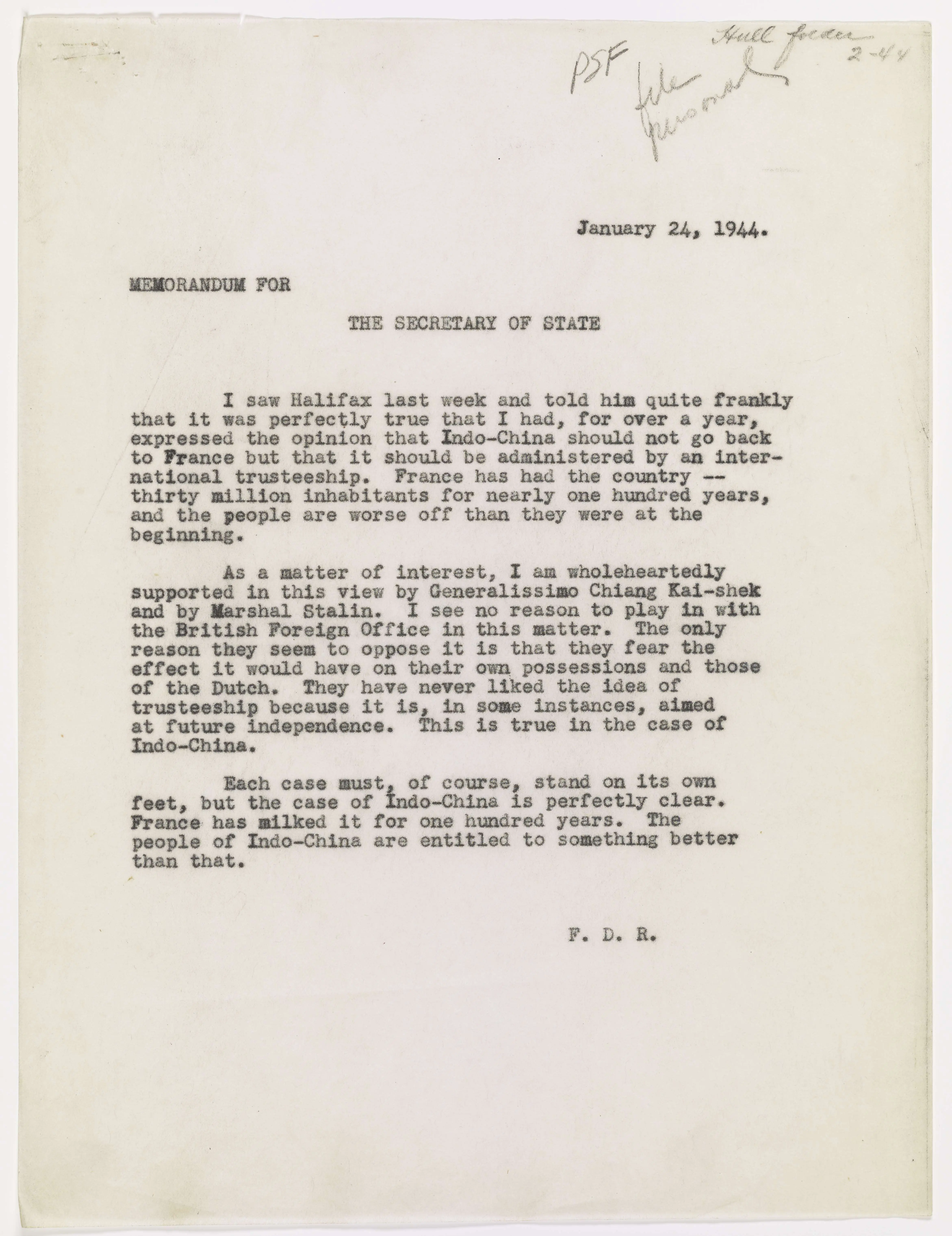 President Franklin D. Roosevelt opposed continued French rule of Vietnam following World War II. In this memo he wrote: “France has milked it for one hundred years. The people of Indochina are entitled to something better than that.”