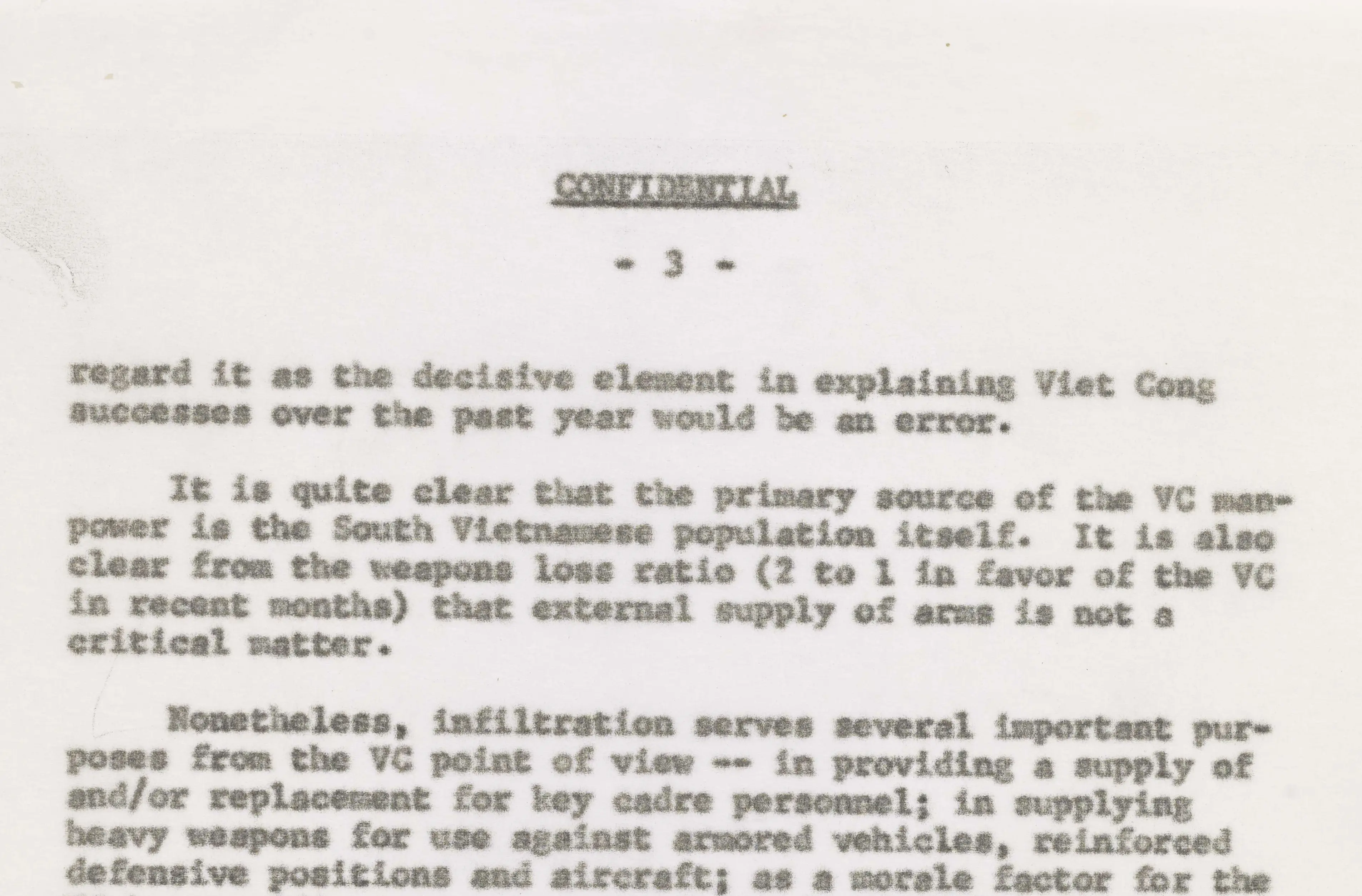 In this memo, State Department official William Jorden concludes, “the infiltration of men and material from outside South Viet Nam in support of the Viet Cong is continuing…[but] to regard it as the decisive element…would be an error. It is quite clear that the primary source of the VC manpower is the South Vietnamese population itself.”