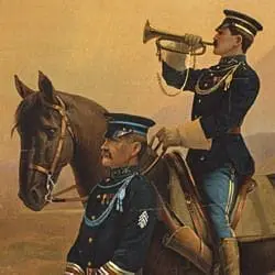 This pre-World War I U.S. Army recruiting poster by artist Michael P. Whelan depicts an infantry sergeant with a rifle standing alongside a cavalry trooper on horseback blowing a bugle. The colors of the men’s hats are different for a reason: the blue represents the infantry; yellow denotes cavalry. Note the wide-open spaces in the poster’s background, suggesting the American West.