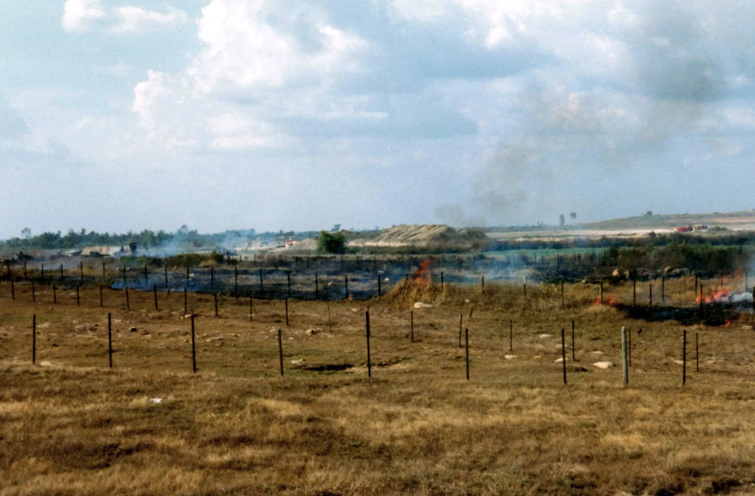 The original caption for this photograph reads: A Minefield at Bien-Hoa Air Base in the Republic of Vietnam (RVN) on Fire, Somewhere in There an Army of the Republic of Vietnam (ARVN) Soldier Lies Wounded After Stepping on a Land Mine.
