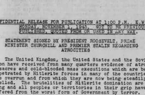 The statement on atrocities declared that when a new government was established in Germany, any leaders “who have been responsible for or a consenting part” in atrocities would be sent to the countries where “their abominable deeds were done” for sentencing by the laws of those countries. Further, they declared that the Allied Powers – the United States, the United Kingdom, and the Soviet Union – would “pursue them [the perpetrators] to the uttermost ends of the earth” to bring them to judgment.