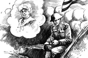 In this image, cartoonist Clifford Berryman captures the spirit of Mother’s Day by showing an American soldier sitting on the edge of his trench with his rifle at his side and an American flag waving above him. Here amidst the chaos of battle during World War I, the soldier writes a letter to his mother, with her image clearly in his mind.