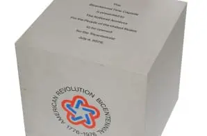 The National Bicentennial Time Capsule was created as an officially recognized American Revolution Bicentennial Administration project. It was one of 56 time capsules developed and manufactured by Reynolds Metal Company as a bicentennial gift to the United States. It is to remain in the National Archives and to be opened on July 4, 2075. The engraving on the capsule states, “The Reynolds Metal Company Bicentennial Time Capsule to be presented to the Governors of 50 States, 4 Territories, and Our Nation’s Capital to be opened July 4, 2075.”