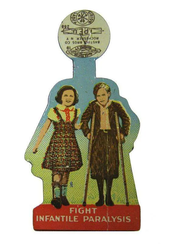 This unused multi-colored lapel tab depicts a young girl in leg braces and a young boy on crutches. Below the image is text that reads: FIGHT INFANTILE PARALYSIS.