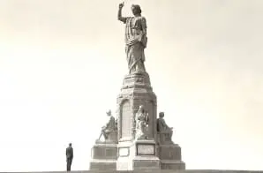 The National Monument to the Forefathers by Hammatt Billings was unveiled in 1889 in Plymouth, Massachusetts. The monument consists of five allegorical figures representing Faith, Morality, Education, Law, and Liberty. The central figure of Faith is depicted holding a bible in her left and pointing to the sky with her right hand and is set on top of a forty-five foot shaft. The four other allegoricak figures are depicted seated.