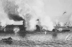 Full Citation: Naval Engagement in Hampton Roads. Merrimac and Monitor. March 1862. Copy of print by J. Davies after C. Parsons; 1863; Records of the National Archives and Records Administration, Record Group 64. [Online Version, https://docsteach.org/document/naval-engagement-in-hampton-roads-merrimac-and-monitor-march-1862-copy-of-print-by-j-davies-after-c-parsons/, January 9, 2026]