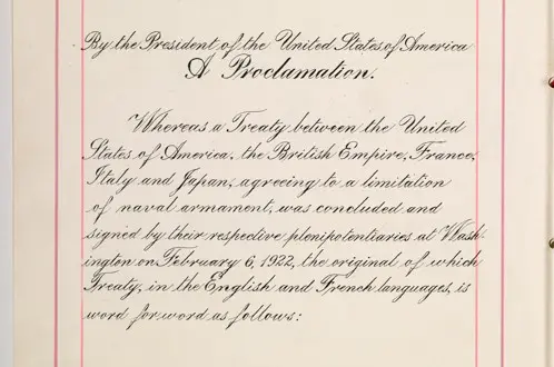 Full Citation: Naval Limitation Treaty; 2/6/1922; Perfected Treaties, 1778–1945; General Records of the United States Government, Record Group 11; National Archives Building, Washington, DC. [Online Version, https://docsteach.org/document/naval-limitation-treaty/, December 17, 2025]