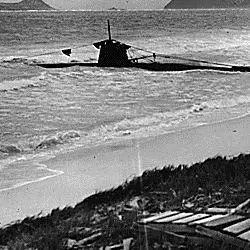 Naval photograph documenting the Japanese attack on Pearl Harbor, Hawaii which initiated US participation in World War II. Navy's caption: A beached two-man Japanese submarine found on the edge of Bel