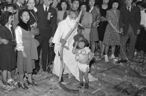 The original caption for this photograph is “Topaz, Utah. Evacuees celebrate New Year’s Eve. Japanese Americans at Central Utah Relocation Center celebrated reopening of the west coast with a big New Year’s Eve party. Joseph Aoki portrays Father Time and his son Tommy, Baby New Year.”