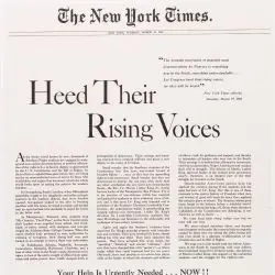 This advertisement is an exhibit from the court case Abernathy v Patterson involving Martin Luther King, Jr. The advertisement calls for support of the civil rights movement and is signed by 100 prominent citizens. The central issue of this case was an advertisement placed in the “New York Times” and endorsed by many prominent individuals. The advertisement encouraged support for the Martin Luther King, Jr. Defense Fund. It also alleged police action directed against civil rights demonstrators. This case is related to the landmark Supreme Court case, New York Times v. Sullivan, in which the U.S. Supreme Court ruled on the issue of freedom of the press and freedom of speech.
