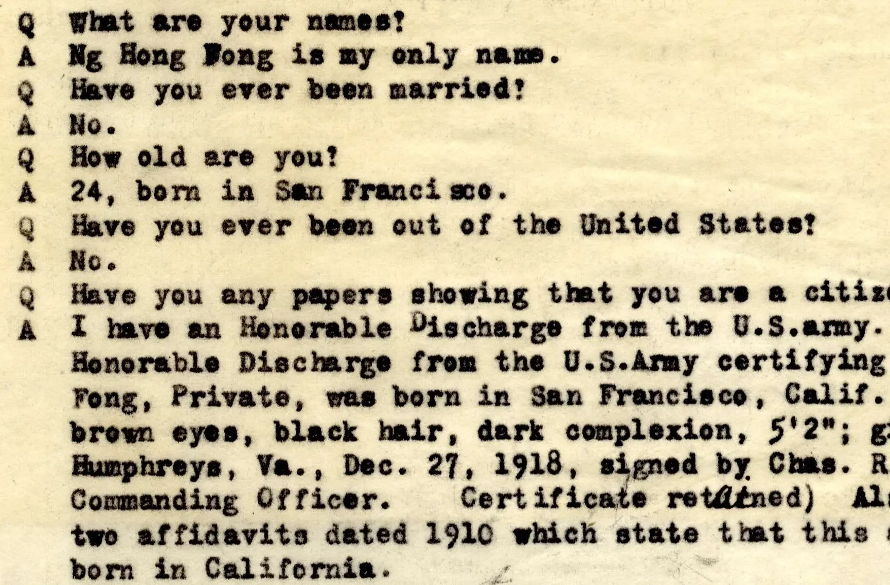 This Immigration Service interview of Ng Hong Fong was conducted for his Return Certificate as a Native, allowing him to return to the United States under the rules of the Chinese Exclusion Act.