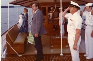 This photograph shows President Richard Nixon, First Lady Pat Nixon and their daughter Tricia Nixon on the Presidential Yacht U.S.S. Sequoia at Pier 1 in the Washington Navy Yard.