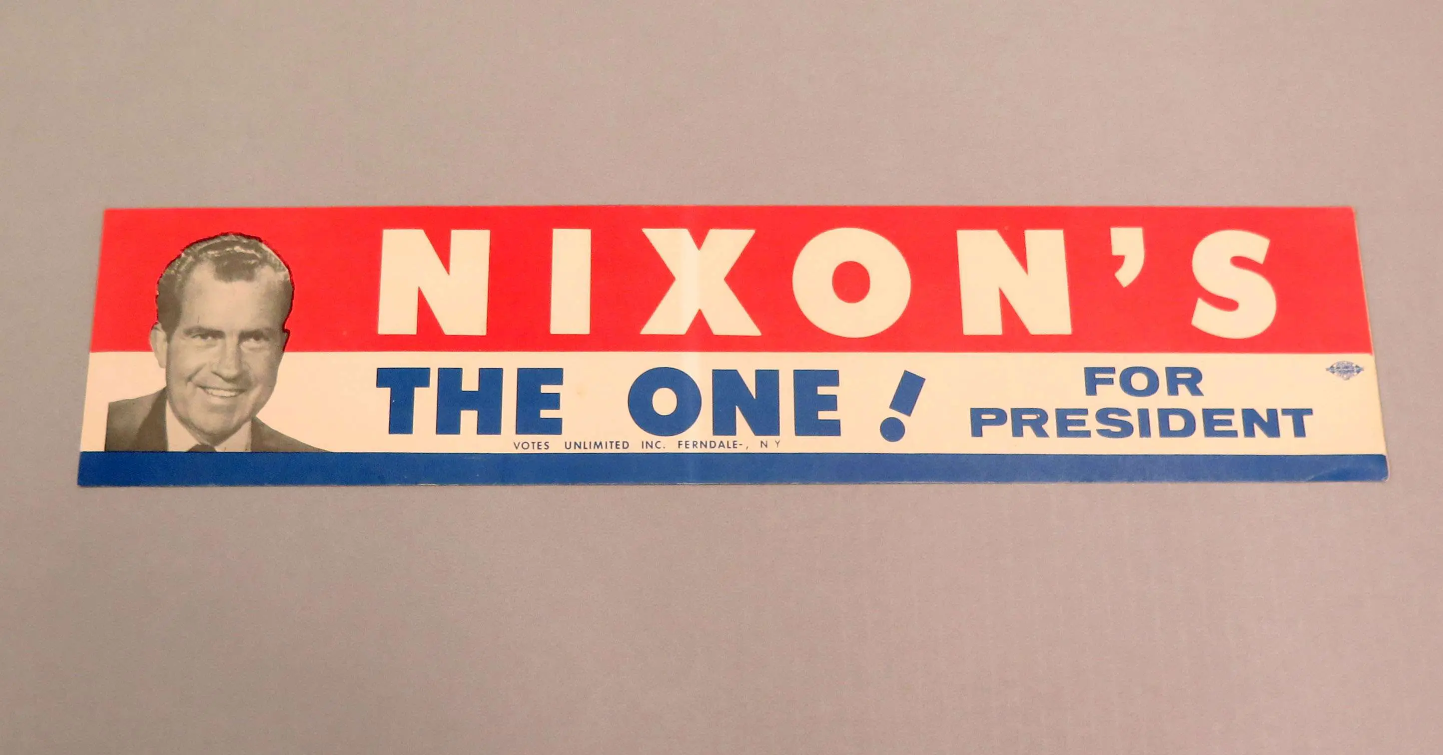 This red, white and blue bumper sticker shows an image of Nixon and says “Nixon’s the One! For President.”