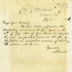 This note from President Lincoln to Major General Halleck was sent after the Union victories at Vicksburg and Gettysburg. In the note Lincoln expresses his view that if General George Meade could destroy Confederate General Robert E. Lee’s army before it crossed the Potomac River, the war would be over.