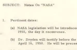 This memorandum was prepared for Dr. James Killian, President Eisenhower’s Special Assistant for Science and Technology. It noted that legislation establishing the National Aeronautics and Space Administration (NASA) would be introduced in Congress on April 14, 1958, and outlined how the new agency would get started, including its budget and leadership.