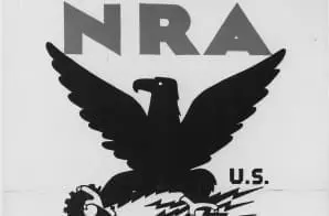 This NRA (National Recovery Administration) blue eagle poster was displayed by businesses during the New Deal to show support for the government program.
