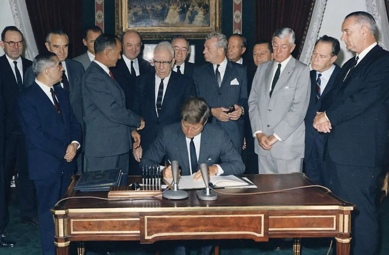 This photograph shows President John F. Kennedy signing the Nuclear Test Ban Treaty. Also shown are: (first row) Senator John Pastore, Senator J.W. Fulbright, Senator George Aiken, Senator Everett Dirksen, Senator Leverett Saltonstall, Senator Thomas H. Kutchel, and Vice President Johnson; and (second row) an unidentified man, Senator Mike Mansfield, John J. McCloy, an unidentified man, W. Averell Harriman, Senator George Smathers, Secretary of State Dean Rusk, Senator Hubert Humphrey, William C. Foster, Senator Howard W. Cannon. It was taken in the White House Treaty Room.