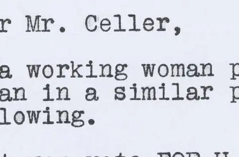 Louise Bushnell, Legislation Chairman of the New York League of Business and Professional Women, sent this letter to Congressman Emanuel Celler in favor of the Equal Rights Amendment (ERA). In it she asks: “Would you really be content, if your female peers in Congress received half your salary? How about that?”