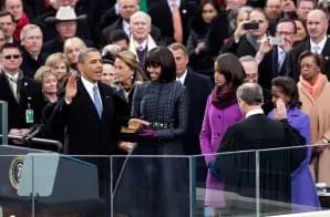 This photograph shows President Barack Obama being sworn in on January 21, 2013. Supreme Court Chief Justice John Roberts administered the oath of office to Obama during the inaugural swearing-in ceremony at the U.S. Capitol in Washington, D.C. First Lady Michelle Obama held a Bible that belonged to Dr. Martin Luther King Jr. and the Lincoln Bible. Daughters Malia and Sasha Obama also stood with the President as he was sworn in. Members of the crowd include Mitch McConnell, John Boehner, Chuck Schumer, David Axelrod, and Marian Robinson.