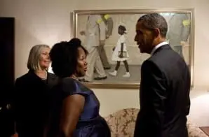 The photograph was taken on July 15, 2011, when Bridges visited the White House. The iconic painting in the background – The Problem We All Live With by Norman Rockwell – shows U.S. Marshals escorting Bridges into her school.