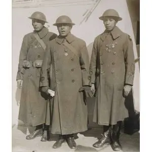 Original Caption: Officers of the Famous Colored Regiment which Arrived Home on the “France.” Left to right: Maj. J.R. White; Lt. Col. Otis B. Duncan, highest ranking colored officer in the U.S. Army; Lt. W.J. Warfield. The first of Colonel William Hayward’s troops to return. These officers were all decorated by France and the United States. Officers of the 369th (old 15th New York City) and 370th (Ill.) colored infantry.