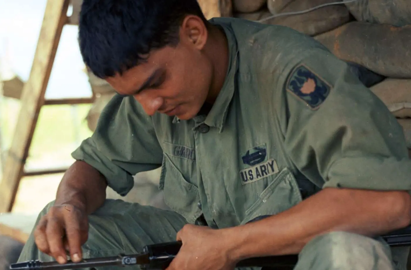 Original caption of this photograph reads: Operation Shelby—PFC Manuel Garcia (El Centro, Calif.) rifleman, Co. E, 3rd Bn, 7th Inf, 199th Light Inf. Bde., cleans his M–16 rifle prior to going out on a daily patrol at the new forward base camp located at the Kinh Kang and Kanh Nang Canals, 24 km west of Saigon.