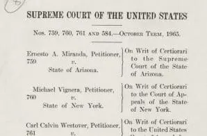 In 1963, Ernesto Miranda was arrested in Arizona and charged with kidnapping, robbery, and rape. When questioned by police, Miranda confessed. He was tried and convicted based on his confession. Miranda appealed his conviction to the U.S. Supreme Court, which ruled in 1966 that statements made by the accused may not be admitted in court without procedural safeguards. Page 31 from the decision describes two of those safeguards—the accused’s right to remain silent and to have an attorney present during questioning. Selected pages are shown.