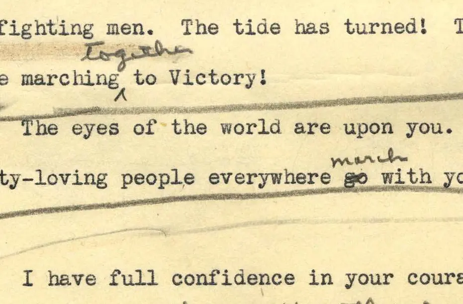 General Dwight D. Eisenhower annotated this draft of the Order of the Day for the Allied invasion of Normandy during World War II. Thousands of copies of the final version were printed and distributed to Allied soldiers before the invasion, which took place on June 6, 1944.