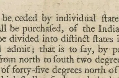 Resolved, That so much of the territory ceded or to be ceded by individual states to the United States, as is already purchased or shall be purchased of the Indian inhabitants, and offered for sale by Congress, shall be divided into distinct states in the following manner, as nearly as such cessions will admit; that is to say, by parallels of latitude, so that each state shall comprehend from north to south two degrees of latitude, beginning to count from the completion of forty five degrees north of the equator; and by meridians of longitude, one of which shall pass through the lowest point of the rapids of Ohio, and the other through the western cape of the mouth of the great Kanhaway; but the territory eastward of this last meridian, between the Ohio, Lake Erie, and Pennsylvania, shall be one state, whatsoever may be its comprehension of latitude. That which may lie beyond the completion of the 45th degree between the said meridians shall make part of the state adjoining it on the south; and that part of the Ohio, which is between the same meridians coinciding nearly with the parallel of 39° shall be substituted so far in lieu of that parallel as a boundary line.