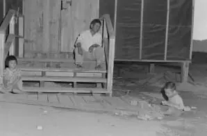 The original caption for this photograph reads: Poston, Arizona. Mosaru Oshio with his children on the steps of his barrack home at this War Relocation Authority center for evacuees of Japanese ancestry.