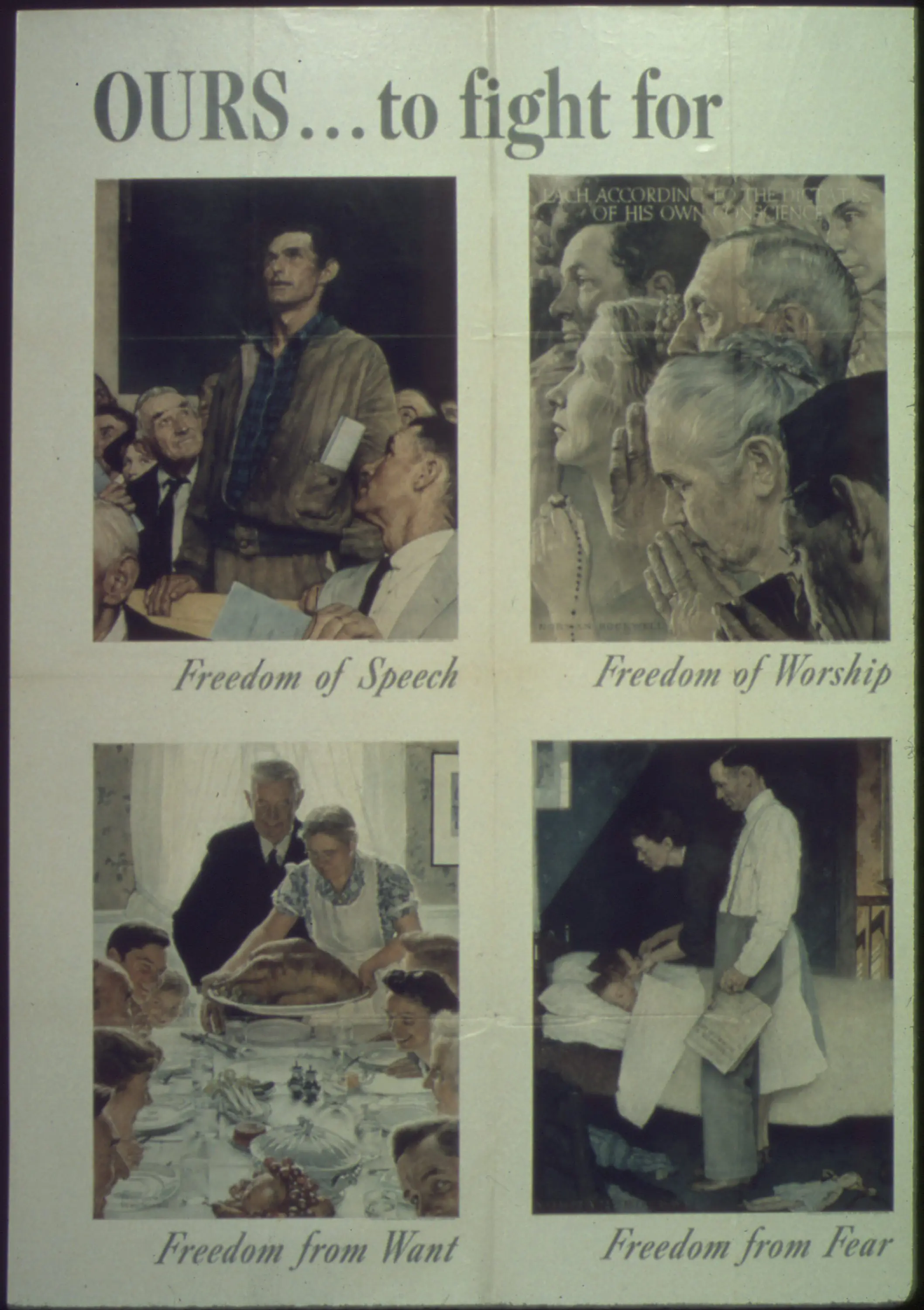 Full Citation: OURS TO FIGHT FOR. 4 FREEDOMS ON ONE SHEET; 1941-1945; World War II Posters, 1942–1945; Records of the Office of Government Reports, Record Group 44; National Archives at College Park, College Park, MD. [Online Version, https://docsteach.org/document/ours-to-fight-for-4-freedoms-on-one-sheet/, December 19, 2025]