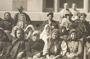 This undated photograph captures a group of immigrants outside a building on Ellis Island. The Immigration Station at Ellis Island in New York Harbor was the major East Coast processing center for immigrants who came to the United States between 1892 and 1924. An estimated 20 million individuals began their new lives in America here.