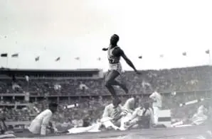 This photograph shows Jesse Owens doing the long jump during the 1936 Olympics in Berlin, Germany. Owens won four gold medals in track and field. His performance was widely considered a blow to the Nazi belief in Aryan supremacy.