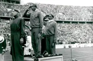 This photograph shows Jesse Owens representing the United States in gold-medal position on top of the podium at the 1936 Olympics in Berlin, Germany. Owens won four gold medals during the games in track and field. His performance was widely considered a blow to the Nazi belief in Aryan supremacy.