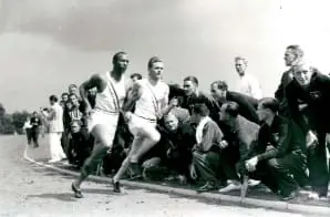This photograph shows Jesse Owens running a race during the 1936 Olympics in Berlin, Germany. Owens won four gold medals during the games in track and field. His performance was widely considered a blow to the Nazi belief in Aryan supremacy.