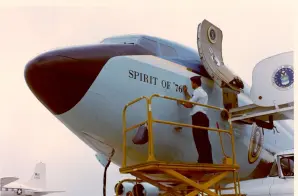 Full Citation: Photograph WHPO-6877-07; U.S. Air Force Airman Painting ‘Spirit of ’76’ on the Nose of Air Force One; 7/29/1971; Nixon White House Photographs, 1/20/1969 – 8/9/1974; Collection RN-WHPO: White House Photo Office Collection (Nixon Administration),; Richard Nixon Library, Yorba Linda, CA. [Online Version, https://docsteach.org/document/painting-air-force-one/, April 4, 2026]