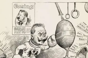 In this cartoon, German Kaiser Wilhelm II runs on a treadmill as three phonographs play the words of President Theodore Roosevelt. A month earlier, The Washington Post had published a mock conversation between the Kaiser and Roosevelt that ended with Roosevelt saying “There are some short and ugly words in German.” “Short and ugly” appear as words coming out of a phonograph in the cartoon along with familiar phrases associated with Roosevelt. The cartoonist implies that the Kaiser was copying the fitness regime of the President, who had employed a White House boxing coach.
