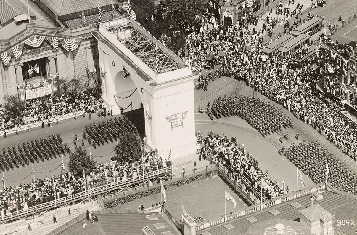 Full Citation: Photograph 18-AA-154-86; Washington D.C. – Parades and Receptions; 1919; Washington D.C. – Parades and Receptions; “Airscapes” of American and Foreign Areas, 1917 – 1964; Records of the Army Air Forces, Record Group 18; National Archives at College Park, College Park, MD. [Online Version, https://docsteach.org/document/parades-receptions-washington-dc/, April 1, 2026]