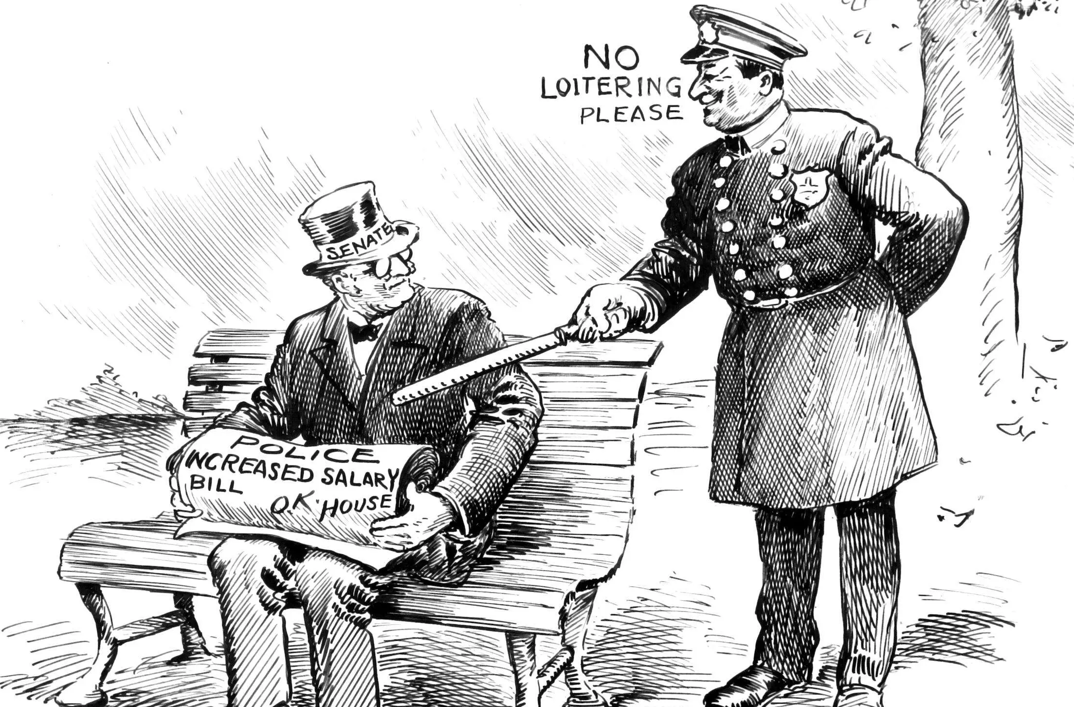 Congress is the only branch of the Federal Government with the power to make laws, but it is not easy for the House and Senate to jointly pass legislation. The Constitution requires that for a bill to become law, the House and Senate must pass identically worded bills. Because the House and Senate represent the public in different ways, they often look at issues from different perspectives, making agreements hard to achieve. As this cartoon shows, a bill that sails through one chamber can become bogged down in the other. Although the House of Representatives had already approved a salary increase bill for DC policemen, the Senate had not yet acted on the bill. Cartoonist Clifford Berryman does a little lobbying for the police, with a policeman directing the Senate to quit loitering and pass the bill.
