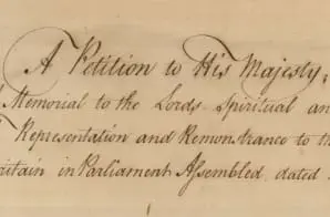 Inviolably attached to your Royal Person and Government, to which we are bound by the strongest Ties of Duty and Affection, and in the fullest Assurance that your paternal Care is extended over all your People, as well the Inhabitants of the new World, as those who flourish, and are happy under your more immediate Influence in the old, we are emboldened to throw ourselves at your Majesty’s Feet, humble Petitioners, in Behalf of the loyal Colony which we represent.