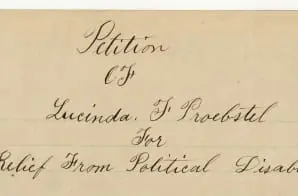 In this petition to Congress, Lucinda Proebstel requests a relief from her political disabilities. This petition was part of a petition drive organized by the National Woman Suffrage Association (NWSA) calling for a constitutional amendment that would give women the right to vote. The petition closely follows a template provided by NWSA (an example of this type is the Petition of Dr. Clemence Lozier). The organization encouraged women to personalize their messages to Congress by including their personal reasons for desiring the the right to vote. In her petition, Lucinda Proebstel expresses that she wants to vote because in the state of Oregon, women are classed with minors and persons of unsound mind.