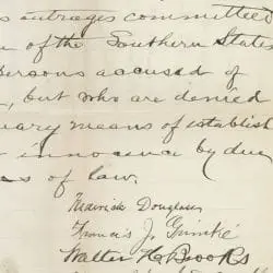 This petition is signed by Frederick Douglass, Francis J, Grimkie, Walter R. Brooks, and Mary Church Terrell. Referring to lynching, it requests a Judiciary Committee hearing on the “lawless outrages committed in some of the Southern States upon persons accused of crime, but who are denied the ordinary means of establishing their innocence by due process of law.”