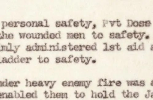In this statement, 2nd Lieutenant Kenneth L. Phillips describes how Private First Class Desmond Doss gave medical aid to men under “a vicious hail of enemy grenade and motor fire.”