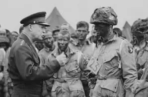This photograph shows General Dwight D. Eisenhower giving the order of the day – “Full victory-nothing else” – to paratroopers of the 101st Airborne Division in England. Eisenhower visited them on the eve of the Normandy invasion, moments before they boarded airplanes to participate in the first assault of occupied France on D-Day.