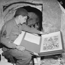Original caption: Master Sergrant Harold Maus of Scranton, PA is pictured with the Durer engraving, found among other art treasures at Merker.